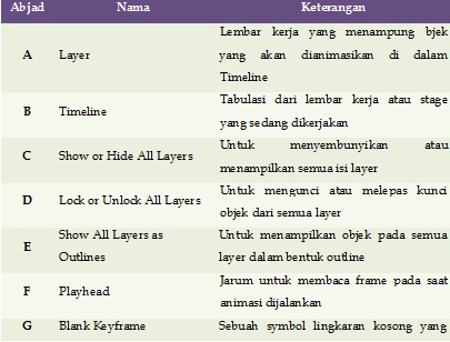 Timeline berguna untuk menentukan durasi animasi, jumlah layer, frame, menempatkan script dan beberapa keperluan animasi lainnya. Semua bentuk animasi yang Anda buat akan diatur dan ditempatkan pada layer dalam timeline.